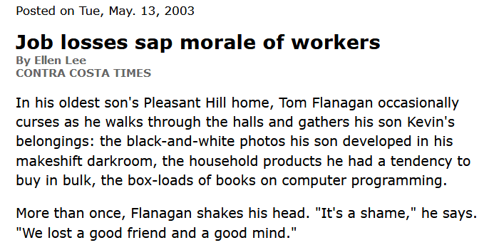 On May 13, The Contra Costa Times reported on an event that should trouble us all—the suicide of Kevin Flanagan, 41. (“Job losses sap morale of workers,” by Ellen Lee – elee@cctimes.com) Kevin was not a drug addict, a convict, or a ne'er-do-well; he was a trained computer programmer with years of experience whose job was sent overseas. The Contra Costa Times story reports that “led by the information-technology industry, 3.3 million service jobs and $136 billion in wages will move from the United States to such countries as India and Russia over the next decade or so.”