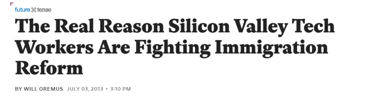 In this case, the furriners are not migrant farm workers but highly skilled tech workers entering the country on H-1B visas. The immigration bill that recently passed the Senate would expand the national cap on these visas from 85,000 to 180,000—or rather, “all the way up to 180,000,” as The Verge’s Ben Popper objectively phrases it. Silicon Valley companies