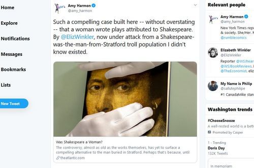 Such a compelling case built here -- without overstating -- that a woman wrote plays attributed to Shakespeare. By @ElizWinkler, now under attack from a Shakespeare-was-the-man-from-Stratford troll population I didn't know existed. https://t.co/1E24kfuh0h