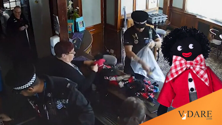 Inevitably (I suppose) someone took offense at the display and made a complaint to the police. Six—count ’em, six—uniformed police officers showed up at the pub, confiscated the golliwogs, and interrogated the landlady. (Her husband was out of the country.) They were, they told the lady, responding to a hate crime complaint.