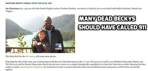 he smart liberal woman, for example, while mouthing the need for total non-discrimination in every area of life, does not practice her liberalism consistently; she does not get sexually involved with violent black parolees. The naive liberal woman, who takes her liberalism straight, like Prudence Hockley in Seattle, gets sexually involved with a violent black parolee and is murdered; or, like Dr. Jeanne Calle in Atlanta, she allows a strange young black man posing as a real estate agent to come unaccompanied to her apartment, because “I don’t want him to think that we don’t trust him,” and five minutes later she is dead; or, like the classic Eloi woman in Bakersfield, California, she continues walking alone toward her car in a parking lot despite the presence of a suspicious-looking black man loitering near her car, because she “didn’t want to seem racist,” and ends up getting kidnapped and raped; or, like Joanna Connors, a reporter for the Cleveland Plain Dealer, who in 2008 told how in 1984 she followed a black man into an empty building after he pretended to be asking for help, while she ignored her misgivings because she did not want to appear racist, and he raped her. “In her articles she argues that despite being raped she did the right thing in not giving in to her feelings of racism.” And so on and on. Rape, horror, the violent death of oneself and one’s loved ones: this is the continual tax paid by Eloi.
