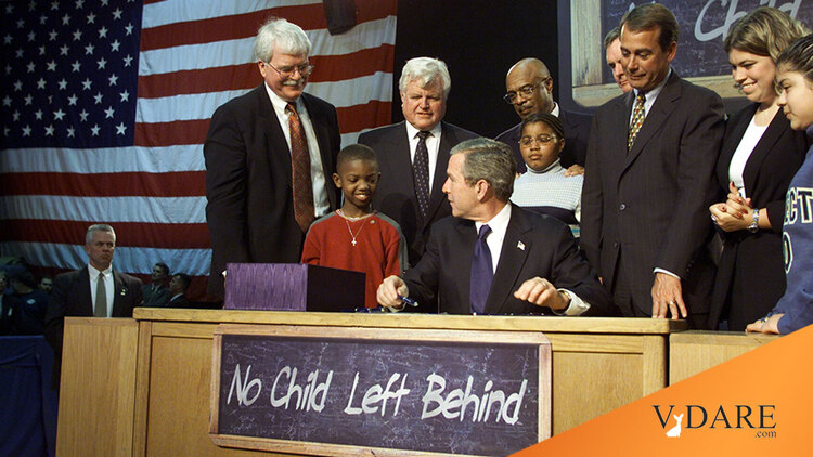 Granted, No Child Left Behind was an incredibly stupid piece of legislation. And yet, it might have helped buy us a decade of social peace because when blacks would complain about not having as much money as whites, nice white people would say, “Yes, but soon education reform is going to fix black people’s problems. No more soft bigotry of low expectations holding blacks back!” And so society was relatively functional, with the lunacy of the Great Awokening forestalled.