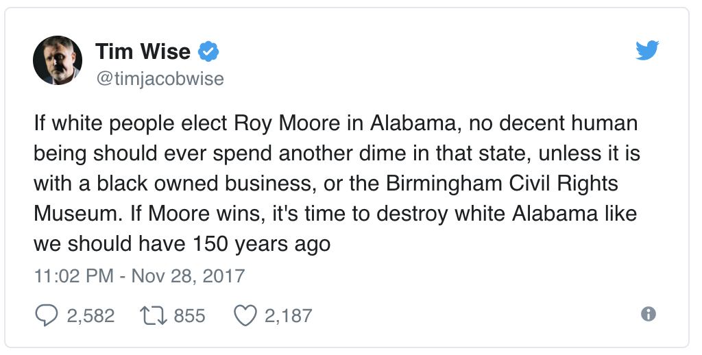 Antiracism Educator: 'Destroy White Alabama' If Roy Moore Wins, Daily Wire, November 29, 2017Chaser.On Tuesday, leftist podcast host and self-described "antiracism educator" Tim Wise called for the destruction of "white Alabama" if Republican Senate candidate Roy Moore wins the race, which he is currently leading.