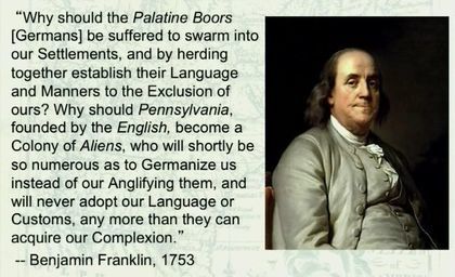 "Why should Pennsylvania, founded by the English, become a Colony of Aliens, who will shortly be so numerous as to Germanize us instead of our Anglifying them... ?"