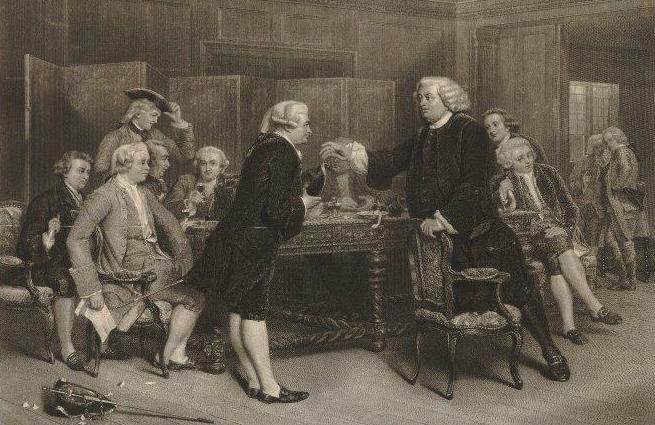 At last, on Monday the 16th of May, when I was sitting in Mr. Davies's back-parlour, after having drunk tea with him and Mrs. Davies, Johnson unexpectedly came into the shop; and Mr. Davies having perceived him through the glass-door in the room in which we were sitting, advancing towards us,—he announced his aweful approach to me, somewhat in the manner of an actor in the part of Horatio, when he addresses Hamlet on the appearance of his father's ghost, “Look, my Lord, it comes.” I found that I had a very perfect idea of Johnson’s figure, from the portrait of him painted by Sir Joshua Reynolds soon after he had published his Dictionary, in the attitude of sitting in his easy chair in deep meditation, which was the first picture his friend did for him, which Sir Joshua very kindly presented to me, and from which an engraving has been made for this work. Mr. Davies mentioned my name, and respectfully introduced me to him. I was much agitated; and recollecting his prejudice against the Scotch, of which I had heard much, I said to Davies, “Don't tell where I come from.”—“From Scotland,”' cried Davies roguishly. “Mr. Johnson, (said I) I do indeed come from Scotland, but I cannot help it.” I am willing to flatter myself that I meant this as light pleasantry to sooth and conciliate him, and not as an humiliating abasement at the expence of my country. But however that might be, this speech was somewhat unlucky; for with that quickness of wit for which he was so remarkable, he seized the expression “come from Scotland,” which I used in the sense of being of that country; and, as if I had said that I had come away from it, or left it, retorted, “That, Sir, I find, is what a very great many of your countrymen cannot help.” This stroke stunned me a good deal; and when we had sat down, I felt myself not a little embarrassed, and apprehensive of what might come next. He then addressed himself to Davies: “What do you think of Garrick? He has refused me an order for the play for Miss Williams, because he knows the house will be full, and that an order would be worth three shillings.” Eager to take any opening to get into conversation with him, I ventured to say, “O, Sir, I cannot think Mr. Garrick would grudge such a trifle to you.” “Sir, (said he, with a stern look,) I have known David Garrick longer than you have done: and I know no right you have to talk to me on the subject.” Perhaps I deserved this check; for it was rather presumptuous in me, an entire stranger, to express any doubt of the justice of his animadversion upon his old acquaintance and pupil. I now felt myself much mortified, and began to think that the hope which I had long indulged of obtaining his acquaintance was blasted. And, in truth, had not my ardour been uncommonly strong, and my resolution uncommonly persevering, so rough a reception might have deterred me for ever from making any further attempts. Fortunately, however, I remained upon the field not wholly discomfited; and was soon rewarded by hearing some of his conversation, of which I preserved the following short minute, without marking the questions and observations by which it was produced.