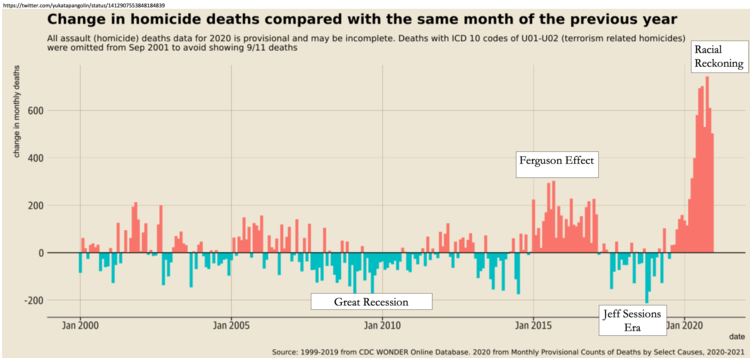 According to the CDC the US had a homicide total of 24,692 in 2020, an increase of 5,551 compared to 2019. That's 29% more homicides, with the majority happening after a spike that coincided with the riots protesting the death of George Floyd pic.twitter.com/nrlo5zvvyN