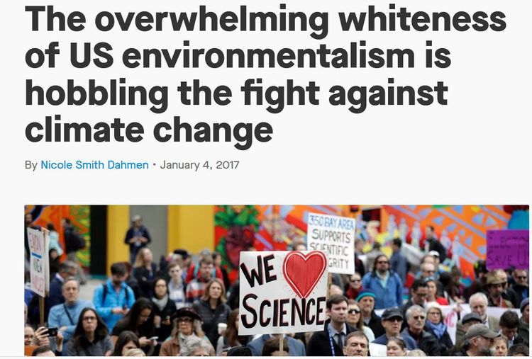 Environmentalism has been an almost exclusively white political movement since its inception but the browning of America is transforming environmentalism into just another political tool for racial grievance-mongers. Lefties at SJW websites like Vox and Quartz have been complaining about environmentalism being "too white" and needing "more diversity" for years now.