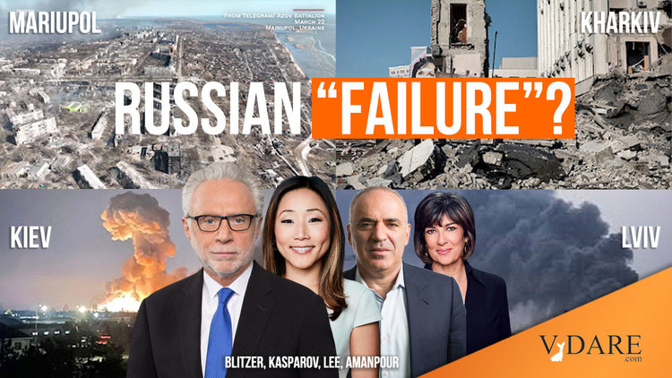 I was just watching CNN, with Wolf Blitzer (a West German–born Jew, which I just learned!) hosting, and a panel of M.J. Lee, their South Korean (born) White House reporter, Russian Jewish “human rights” activist (washed-up, world chess champ) Garry Kasparov, and anti-Semitic, chief world reporter Christiane Amanpour, who was born in London to a Moslem, Iranian father and a Catholic mother [Ukraine: Russia Continuing “Full-Scale Armed Aggression,” March 30, 2022]. (Thus, out of four talking heads, not one was a Christian White man, or born in America.)