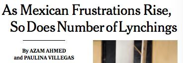 As Frustrations With Mexico’s Government Rise, So Do Lynchings, New York Times, January 24, 2016AJALPAN, Mexico — The lynching began around 7:20 p.m., not long after the brothers had finished conducting their final interviews on tortilla consumption.