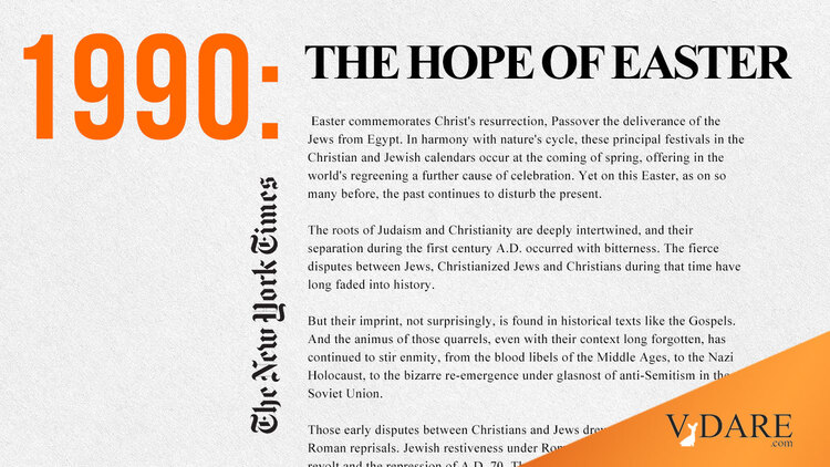 “The New York Times says Easter is an anti-Semitic holiday,” a newspaper colleague told me, most likely on April 16, Easter Monday in 1990. I repaired to All The News That’s Fit To Print, and learned that the day before, the NYT had published The Hope of Easter, an editorial that deserves to be recalled, apropos of James Fulford’s annual War on Easter installment.