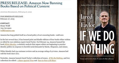 Jared's later books, including his latest, the 2017 title If We Do Nothing, have no Amazon pages. They've been scrubbed. And yet—here's the peculiar thing—if you go to Amazon's Jared Taylor page, it gives a potted biography of the author that includes a list of his books. The list also omits If We Do Nothing, but it includes Jared's 2011 title White Identity: Racial Consciousness in the 21st Century—for which there is no Amazon page!