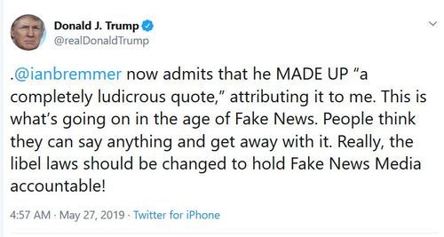 Donald Trump objects to a direct lie that was told about him by poltical scientist Ian Bremner. (Bremner says he meant it as satire, but since he tweeted it in quotes, the MSM treated it as true. See Ian Bremmer Pushes Fake News On Twitter. Will Liberals Care? at The Federalist.)