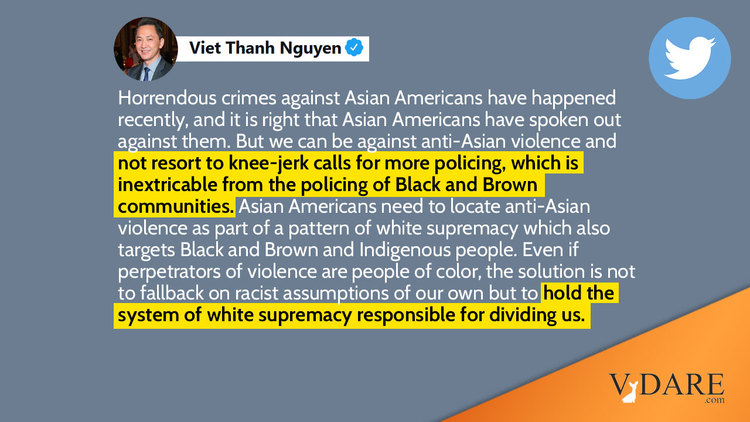 Over the years, I’ve paid a fair amount of attention to the politically correct racist hate coming from USC professor Viet Thanh Nguyen [Email him], a Pulitzer-prize winning novelist, because, compared to most of his peers, he is clearly a smart guy. I wonder if he’s driven by the urge to play the Woke game so vociferously in the hopes that he could bully Hollywood into finally making a movie out of his Great Vietnamese-American Novel, The Sympathizer …