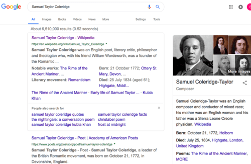 You may not have known that Samuel Taylor Coleridge (1772-1834), author of The Rime of the Ancient Mariner and Kubla Khan, was black, but that’s what Google is here for. Anyway, why are you looking up Samuel Taylor Coleridge during Black History Month instead of Samuel Coleridge-Taylor? That’s racist.