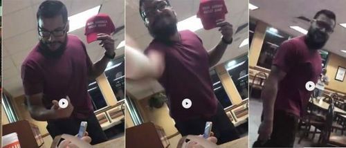 In a video which went viral Wednesday, an angry man in black-rimmed glasses can be seen throwing a soda on Hunter and two friends at 2:35 a.m. on the 4th of July. As the man walks away with the teenager's MAGA hat, he can be heard shouting "this is gonna go great in my f*cking fireplace, bitch," while walking out of the eatery with another man who filmed the encounter.