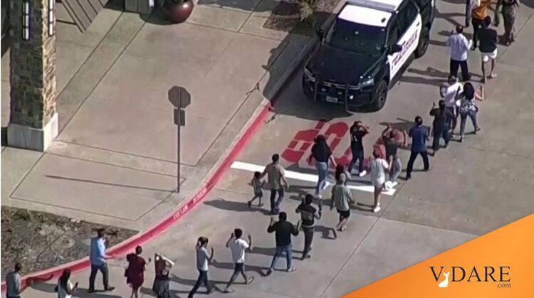 A mass shooting in Allen, TX seems to have ended with the gunman dead. Someone pointed out graphic footage of the deceased gunman, wearing a tactical vest and armed with a rifle, apparently of Hispanic appearance. [Graphic video here/Graphic photo here]