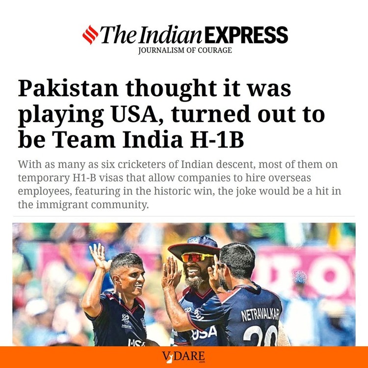 Now there’s a massive influx of Indian immigrants, and as result of them being in America, the ”American” cricket team just beat Pakistan, leading immigrant enthusiasts like Eric Boehm over at Reason magazine to declare it a victory for immigration.