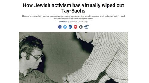 We are constantly lectured that eugenics is anti-Semitic pseudo-science. So even I was kind of surprised to read this article from the Times of Israel about how successful the seeming eugenic campaign against Tay-Sachs disease has been: