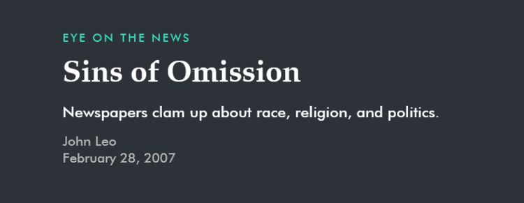 But he's just written a column that might have been ripped from the headlines—VDARE.com headlines, that is.[Sins of Omission | Newspapers clam up about race, religion, and politics.City Journal, February 28, 2007]