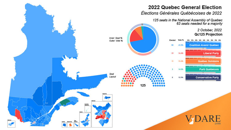 As anticipated, François Legault won Quebec’s elections with an overwhelming majority. Less than 10 minutes after the voting polls had closed, the very official Radio-Canada (the French division of the Canadian Broadcasting Corporation) announced not only that the Coalition Avenir Québec (CAQ) would form the next government, but also that François Legault would count on a majority of Members of the Provincial Parliament in Quebec’s National Assembly [Quebec’s CAQ secures bigger mandate with pledge to cap immigration, protect French, by Allison Lampert and Ismail Shakil, Reuters, October 4, 2022].