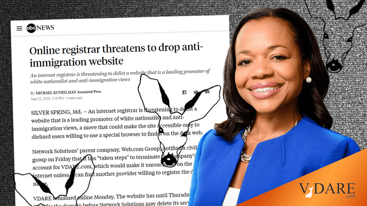 We have been “canceled “ by Network Solutions, the domain name registrar. A registrar is, without being technical, how you can see this page when you type VDARE.com into the URL bar above. (See BREAKING: Network Solutions Driving VDARE.com to the Dark Web? by Lydia Brimelow—you can donate to support us here.)