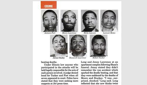 For coverage of lynch-mob style killing of Anthony Stuckey and Jack Moore, two black men killed by a black mob, see Jet Magazine, a black magazine which sometimes has clearer reporting on race than the MSM, because they never think race is not relevant.[ Chicago Fatal Van Crash; Deadly Vigilantism Draws National Attention, Jet, August 29, 2002]