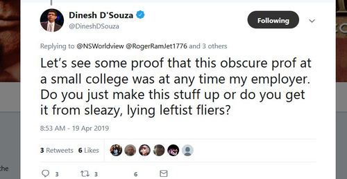 His remarks on Twitter (replying to someone who referenced me as D'Souza's employer) that he could not possibly have worked for me at any time because I am an “obscure prof at a small college” is as fraught with lies as his PR for the GOP reeks with infantile misstatements and exaggerations.