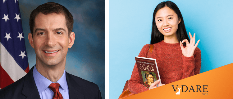 Senator Tom Cotton, (R-Arkansas, A from Numbers USA) recently said that we shouldn’t allow Chinese students to study advanced science in the United States, but that it would be acceptable for them to come here and study “Shakespeare and the Federalist Papers.”