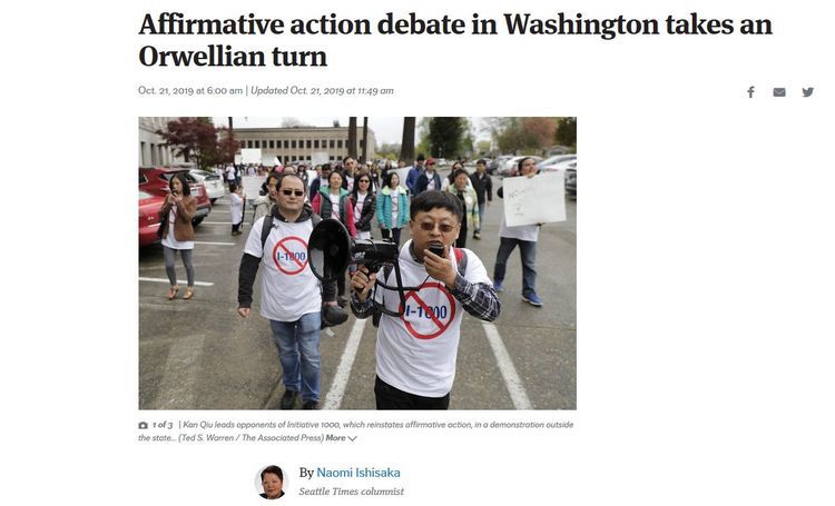 There’s a fun example brewing in the State of Washington (won by Hillary 54-38) that demonstrates once again how the Democrats’ Coalition of the Margins requires constant drumming up of fear and loathing of the White Male Menace to keep their diverse coalition from being at each other’s throats. This time, blacks and Chinese are fighting over affirmative action in state college admissions.