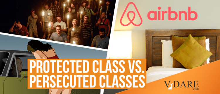 I was reading these articles about AirBnB and I came up with a new term to describe the treatment that people on our side experience. We have had “protected classes” since the advent of so-called anti-discrimination laws which means the group of people who have a statutorily prescribed status that penalizes discrimination against them. Now we also have “persecuted classes” (VDARE.com, American Renaissance, et cetera) a class which was informally created by the unholy alliance of journalists and the Left (JournoFa) and refers to political dissidents who JournoFa demand must be proactively discriminated against. Businesses will actually be publicly shamed for not discriminating enough against persecuted classes.
