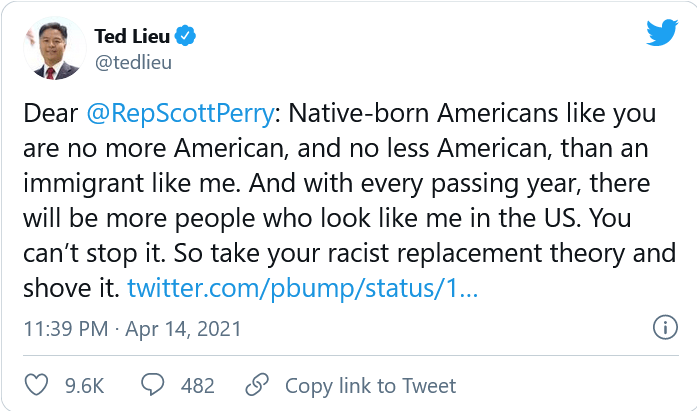 Dear @RepScottPerry: Native-born Americans like you are no more American, and no less American, than an immigrant like me. And with every passing year, there will be more people who look like me in the US. You can’t stop it. So take your racist replacement theory and shove it. https://t.co/By1d2OBzv9