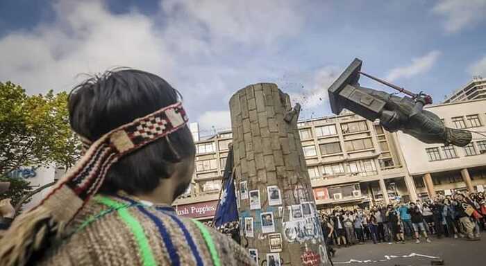 PARADOJAS DE LA VIDA: Manifestantes arrancan el busto de Pedro de Valdivia, desde la plaza llamada Pedro de Valdivia en cual lanzaron desde el Puente Pedro de Valdivia al río Valdivia en la ciudad de Valdivia pic.twitter.com/LsBAJn4fPs
