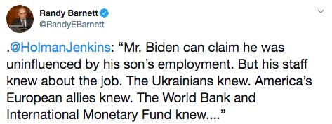 I saw this on Instapundit, about the Russia collusion hoax, and now the Ukrainegate hoax, which is really a "Hunter Biden is not on the take, and neither is Joe" argument: