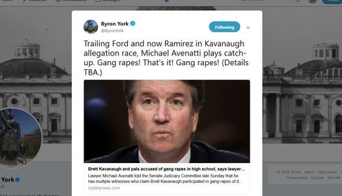 “Trailing Ford and now Ramirez in Kavanaugh allegation race, Michael Avenatti plays catch-up. Gang rapes! That's it! Gang rapes! (Details TBA.)”