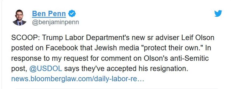DOL staffer Leif Olson resigned from his job on Tuesday after Bloomberg Law claimed he made anti-Semitic comments in old Facebook posts. The post in question was not anti-Semitic. In fact, it mocked the alleged anti-Semitism of the alt-right. The Facebook post sarcastically celebrated Paul Ryan’s win over Paul Nehlen in a 2016 primary race. He joked about “Upper East Side Zionists” and mocked claims Jews run the media in subsequent comments. [Labor Department To Reinstate Aide Wrongfully Accused Of Anti-Semitism, by Luke Rosiak, The Daily Caller, September 4, 2019]