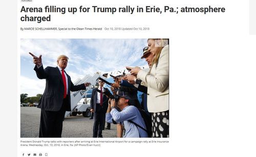 I just attended President Trump's rally in Erie, Pennsylvania and I have to report that things are going very well in Trump country. [Arena filling up for Trump rally in Erie, Pa.; atmosphere charged, By Marcie Schellhammer, Olean Times Herald, October 10, 2018]