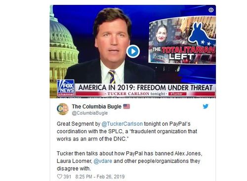 Great Segment by @TuckerCarlson tonight on PayPal’s coordination with the SPLC, a “fraudulent organization that works as an arm of the DNC.”