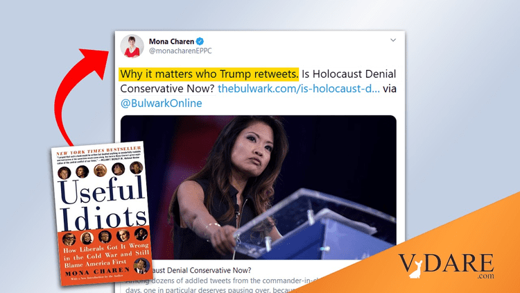 Charen's piece Is Holocaust Denial Conservative Now? Trump’s no-enemies-to-the-right mentality has made it impossible for the right to police itself, The Bulwark, May 20, 2020, starts by calling Michelle "disgraced columnist Michelle Malkin," repeats the "very fine people" libel about Trump supporting "neo-Nazis" after Charlottesville, et cetera, and goes on to say that Michelle, having been deplatformed by Conservatism, Inc for association with the young conservatives calling themselves the Groypers, ought to be deplatformed by everyone, including the President.