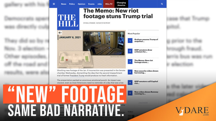 In the first two days of the Senate impeachment trial of Donald Trump you've probably been bombarded with news headlines claiming the release of "new footage" of the January 6th event at Capitol Hill. They call the footage "harrowing," "stunning" and even warn families and teachers to shield their children's eyes before playing the clips. I imagine Senate Democrats worry young white boys in civics class may find the footage stirring after sitting through years of dogmatic programming in the public education system. [The Memo: New riot footage stuns Trump trial, The Hill, February 10, 2021]