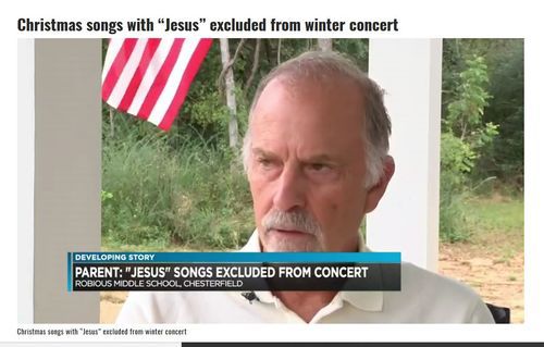 The War on Christmas is starting early this year: according to Karina Bolster at WWBT in Richmond, Virginia, the chorus teacher at Robious Middle School has decided to drop songs mentioning Jesus from upcoming concerts. [Christmas songs with “Jesus” excluded from winter concert, by Karina Bolster, NBC12, October 10, 2018] Note that the title says "Winter Concert"—must not ever say "Christmas Concert"—just as schools no longer have Christmas vacation—just Winter Break.