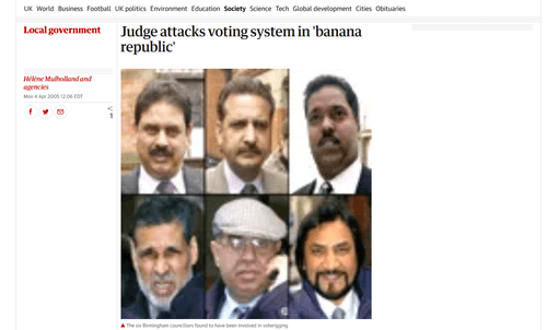 Meanwhile, electoral fraud became a dominating theme. In Birmingham, six Labour councillors were found guilty of running the most corrupt electoral campaign in Britain for well over a hundred years. Over 3,000 postal votes were 'stolen' or amended in favour of the Labour Party, leading the British press to question the integrity of the entire election. In the verdict of the judge, the scandal of Birmingham's local election involved 'electoral fraud that would disgrace a banana republic'. Banana republic, a term dating back to 1935, was resurrected on several occasions in the course of subsequent election debates.