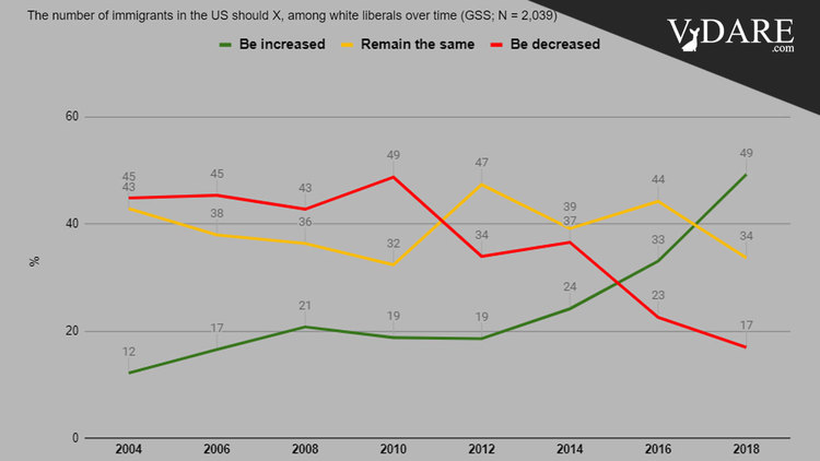 Fair enough, there is a lot of utility in that as a general principle. And it applies in this case, too, but not in the way many would expect. The seismic shift in views on immigration have predominantly been driven by whites, especially white liberals: