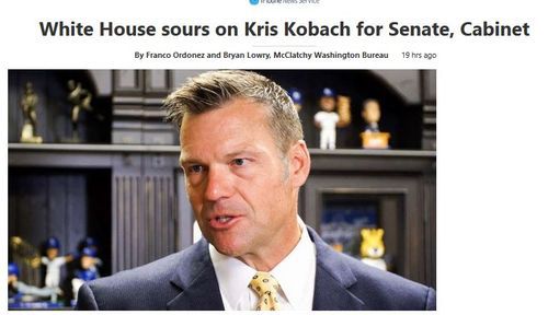 A new report from McClatchy claims the administration is not interested in giving Kobach, an early supporter and adviser to Trump, a cabinet position or support for a possible 2020 Senate run in Kansas. [White House sours on Kris Kobach for Senate, Cabinet, by Franco Ordonez and Bryan Lowry, McClatchy, February 26, 2019]